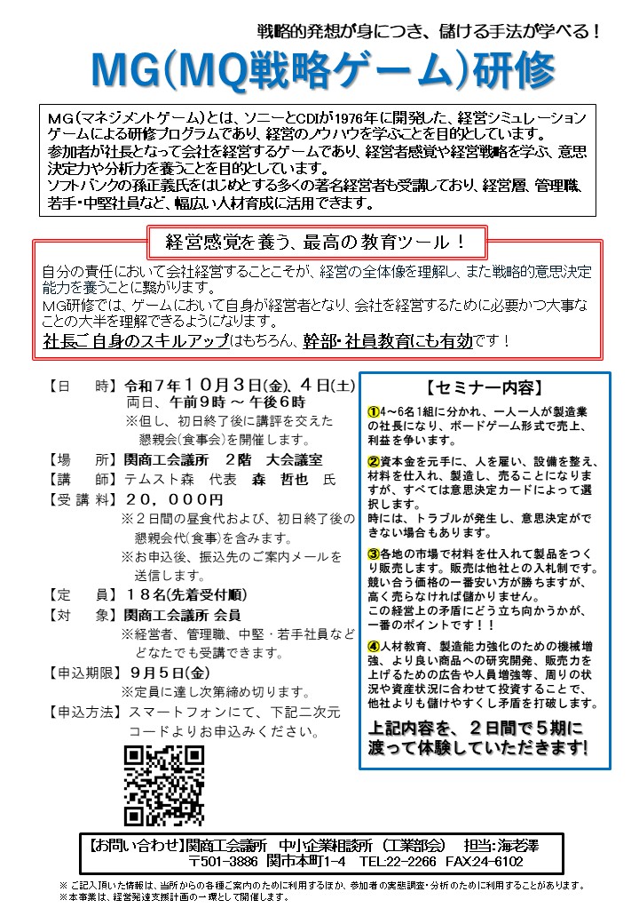 「MG(MQ戦略ゲーム)」とは、参加者自身が社長となって会社を経営するゲームであり、様々な企業で人材育成のために活用されています。