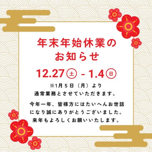 年末年始の業務について 2025年12月25日(木) 今年一年、皆様方には大変お世話になり、誠にありがとうございました。当所の年末年始業務は、下記のとおりです。 ・2025年 12月26日(金)⇒仕事納め ・2025年 12月27日(土)~ 2026年1月4日(日)⇒休業(終日閉館) ・2026年 1月5日(月)⇒仕事始め 2026年も、よろしくお願いいたします。