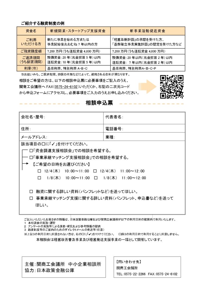 個別相談会 一日公庫 資金調達や事業承継に関するご相談にお答えする個別相談会です。 開催日2025年12月4日(木)、2026年1月8日(木) 開催時間10:00~12:00(1枠1時間) 主催関商工会議所 場所関商工会議所 小会議室 講師・相談員日本政策金融公庫岐阜支店 担当職員 申込方法こちらからお申し込みください。