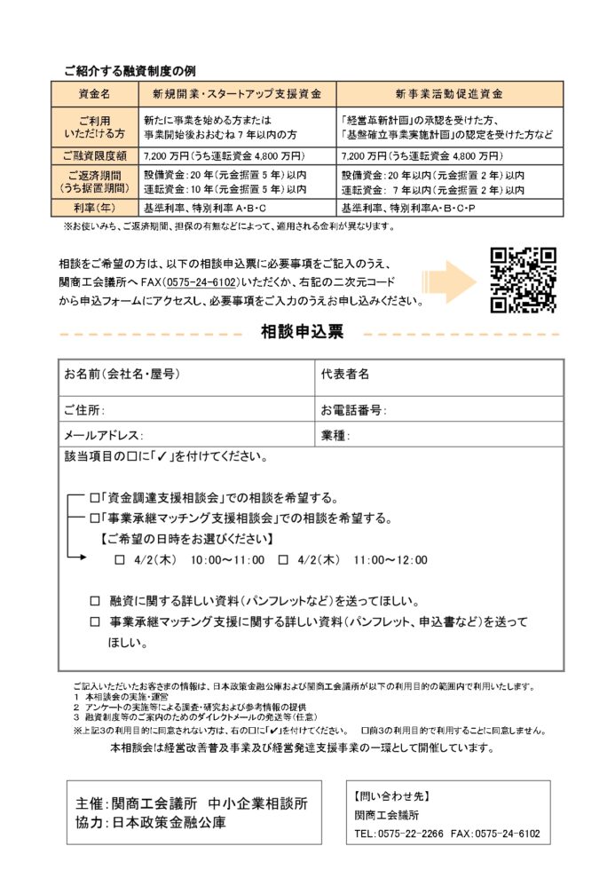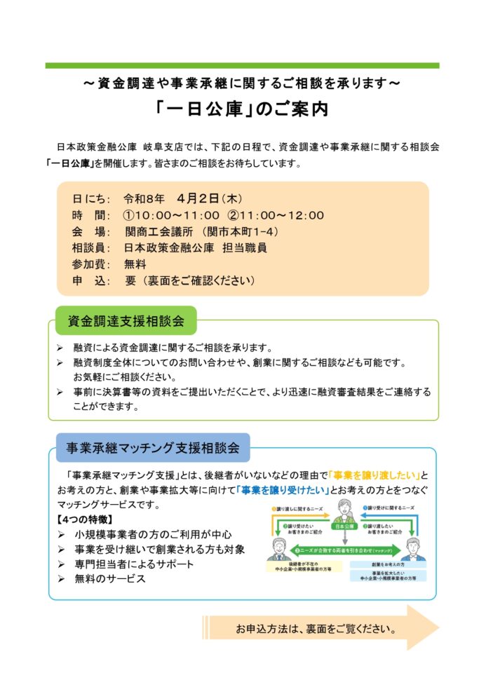 個別相談会 一日公庫 資金調達や事業承継に関するご相談にお答えする個別相談会です。 開催日2026年4月2日(木) 開催時間10:00~12:00(1枠1時間) 主催関商工会議所 場所関商工会議所 商工会議所 講師・相談員日本政策金融公庫岐阜支店 担当職員 申込方法こちらからお申し込みください